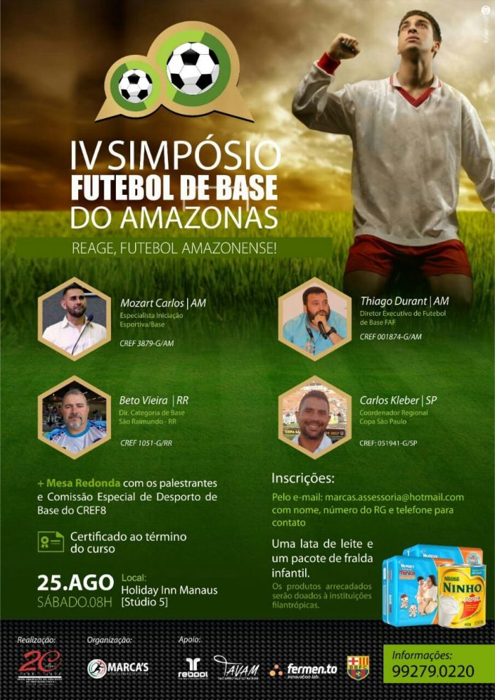O simpósio terá como palestrantes Mozart Carlos (Especialista em Iniciação Esportiva de Base), Beto Vieira (Diretor da Categoria de Base do São Raimundo – RR), Thiago Durante (Diretor Executivo de Futebol de Base da FAF) e Carlos Kleber (Coordenador Regional da Copa São Paulo). Maiores informações pelo telefone (92) 99279-0220.